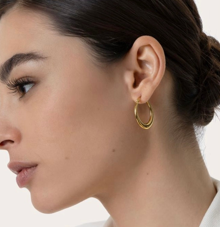 Orecchini in acciaio gold plated modelo goccia con texture smooth. Questo gioiello ridefinisce il minimalismo con una silhouette fluida e sensuale. Il design bold ma elegante lo rende protagonista in ogni look, perfetto da mixare in earrings stack couture o da indossare come pezzo unico per un effetto runway-ready. Chiusura a baionetta. Diametro 2 cm. Nickel tested.